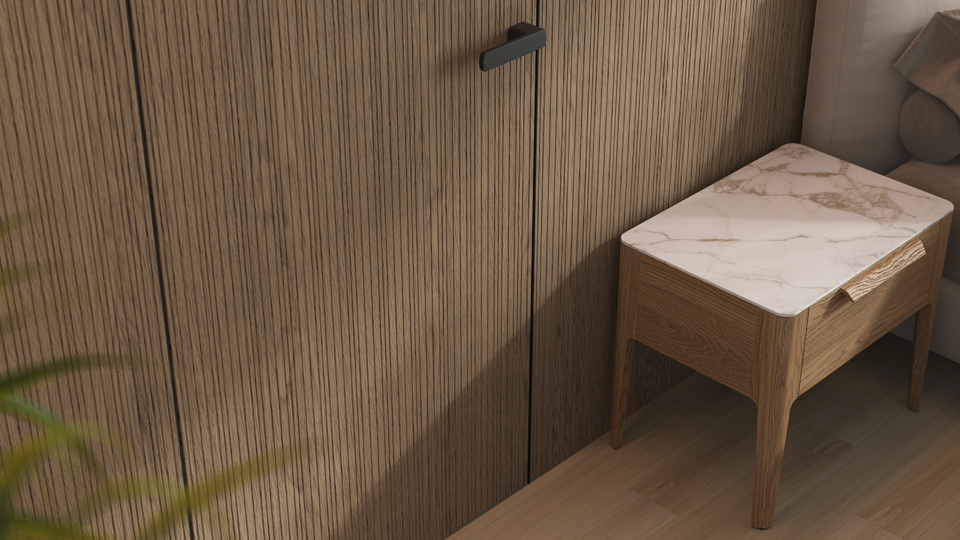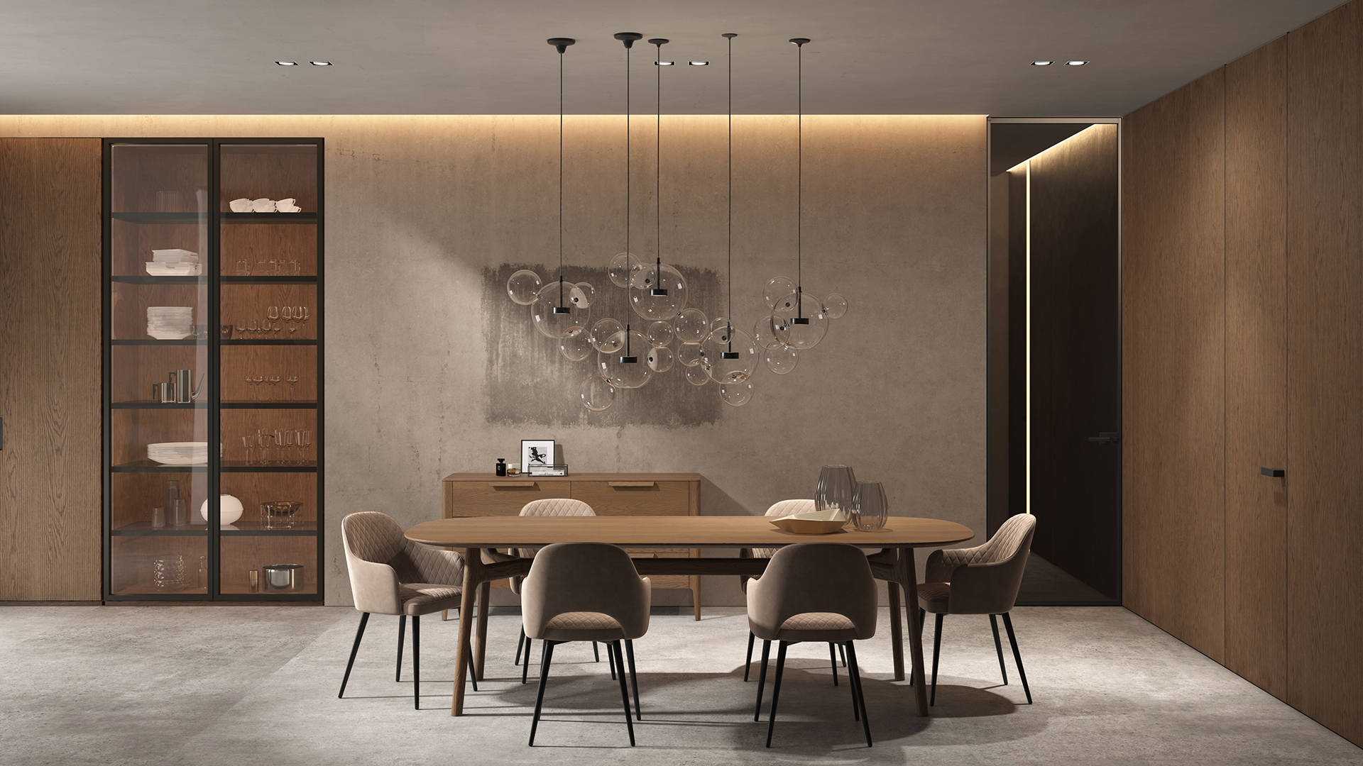 Селект — коллекция минималистичных дверей с фрезеровкой по натуральному шпону. Рельеф на поверхности полотна создаёт игру света и тени, добавляя пространству динамичности и визуального объёма. Двери Селект в сочетании со стеновыми панелями и мебельными фасадами, повторяющими лаконичный дизайн, создают единое стилевое решение.