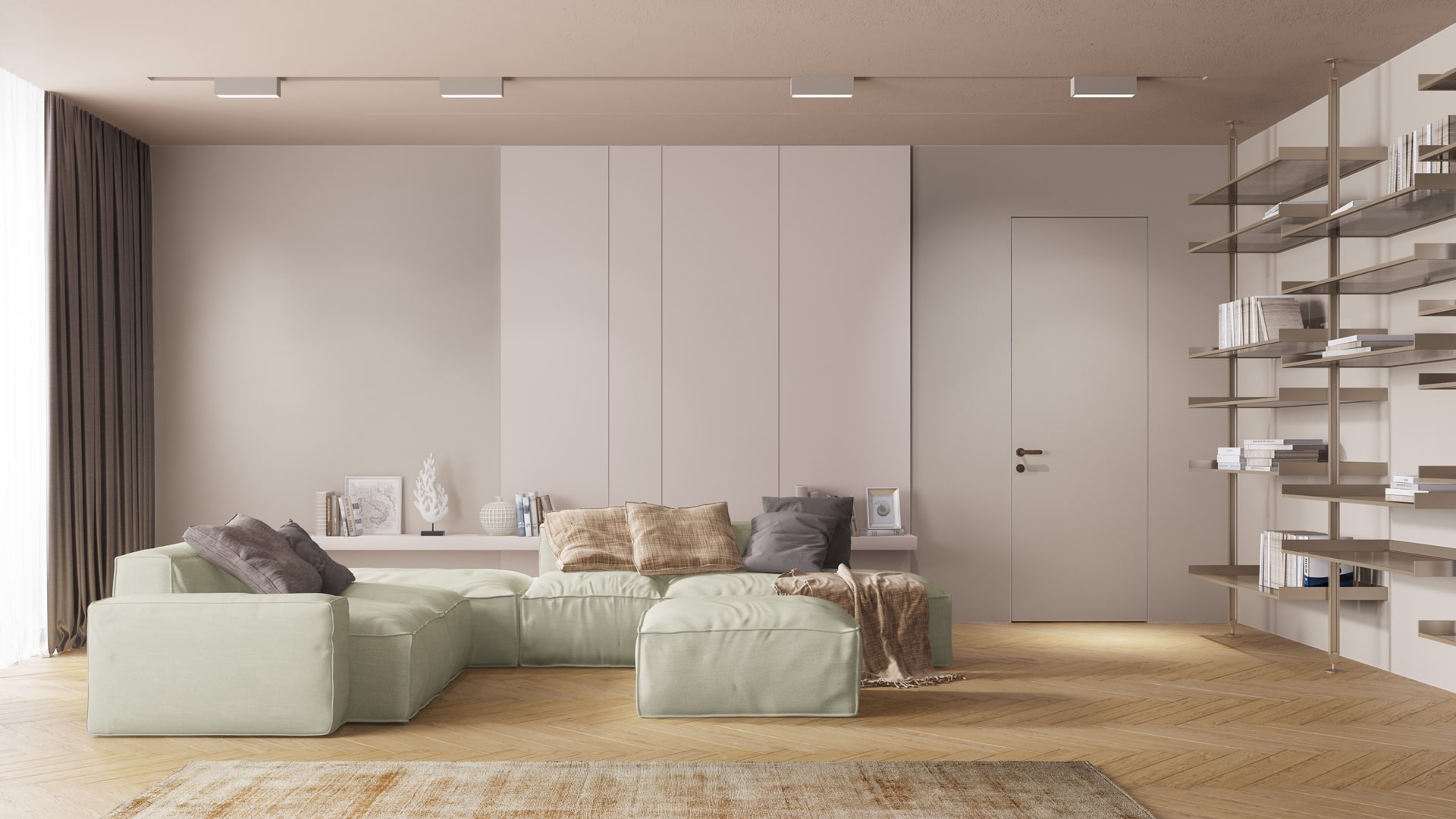 Скрытые двери высотой до трех метров — самое частое решение в современном интерьере. Такие полотна встраиваются в один уровень со стеной, без видимого короба и наличников. Их поверхность можно декорировать любым материалом от краски до обоев.